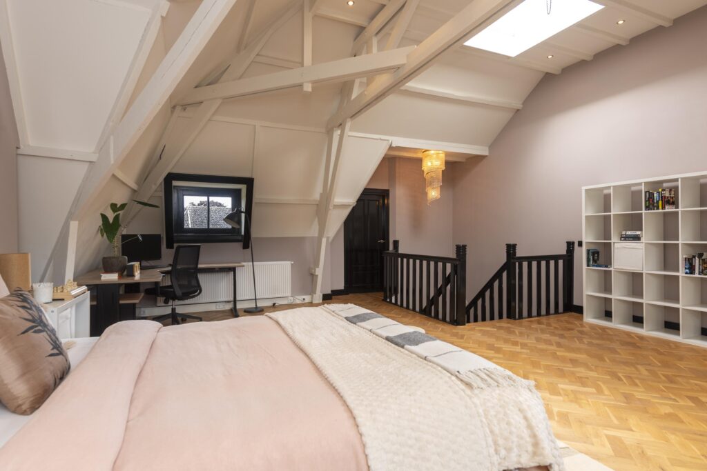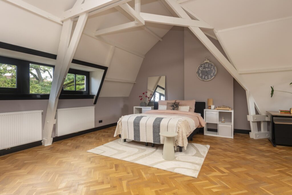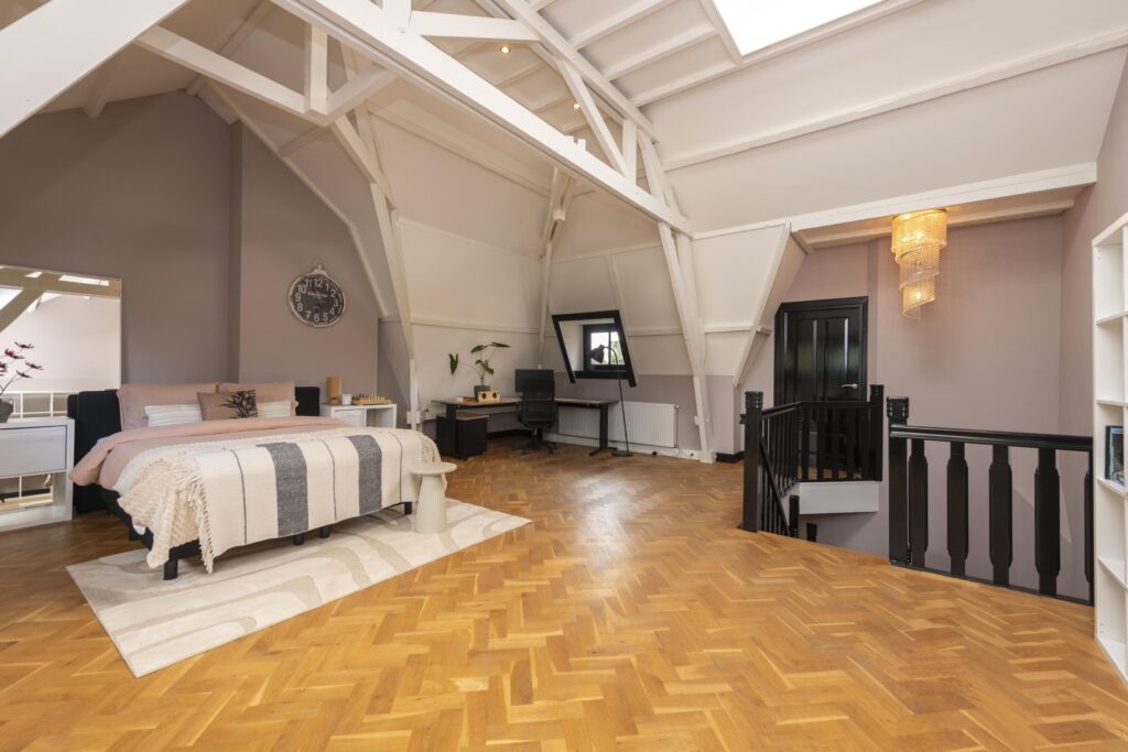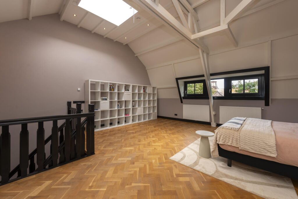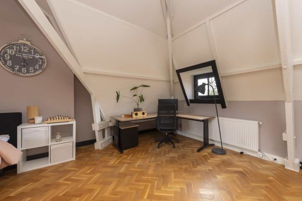 De tweede verdieping biedt verrassend veel ruimte en mogelijkheden. Dankzij de brede indeling is deze verdieping zeer geschikt als slaapkamer, werkkamer of hobbyruimte. Daarnaast leent de ruimte zich uitstekend voor het creëren van meerdere kamers. De volledige verdieping is karakteristiek afgewerkt met een parketvloer, stucwerk en sfeervolle houten balken in het zicht. Daarnaast bevindt zich hier een praktische berging, voorzien van de aansluitingen voor wasapparatuur en de opstelling van de CV-ketel (2014). Hiermee is de ruimte niet alleen comfortabel, maar ook zeer functioneel.