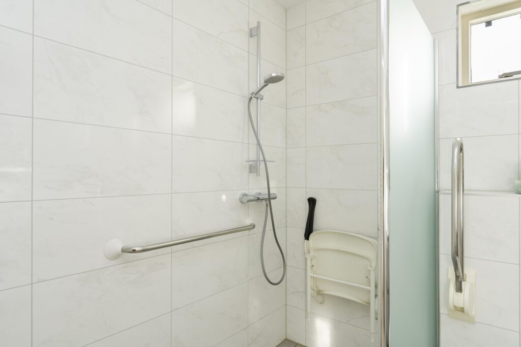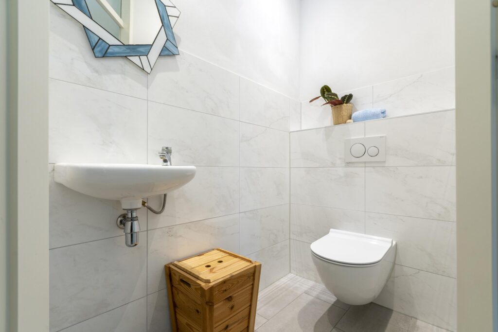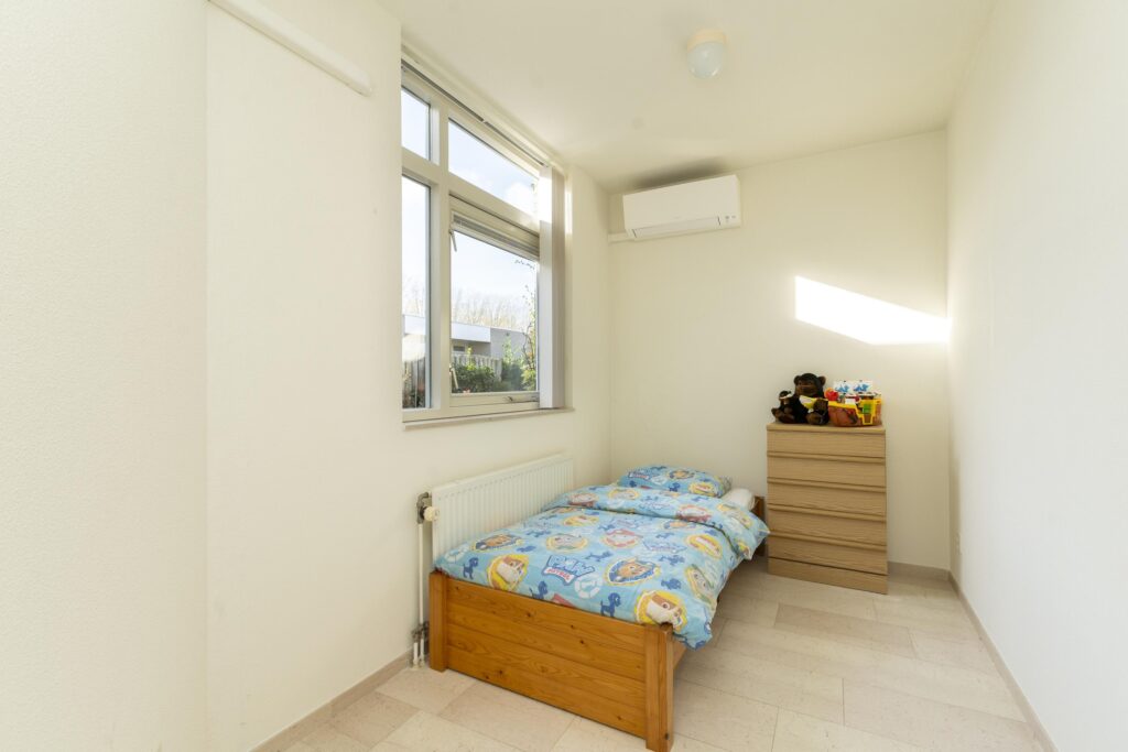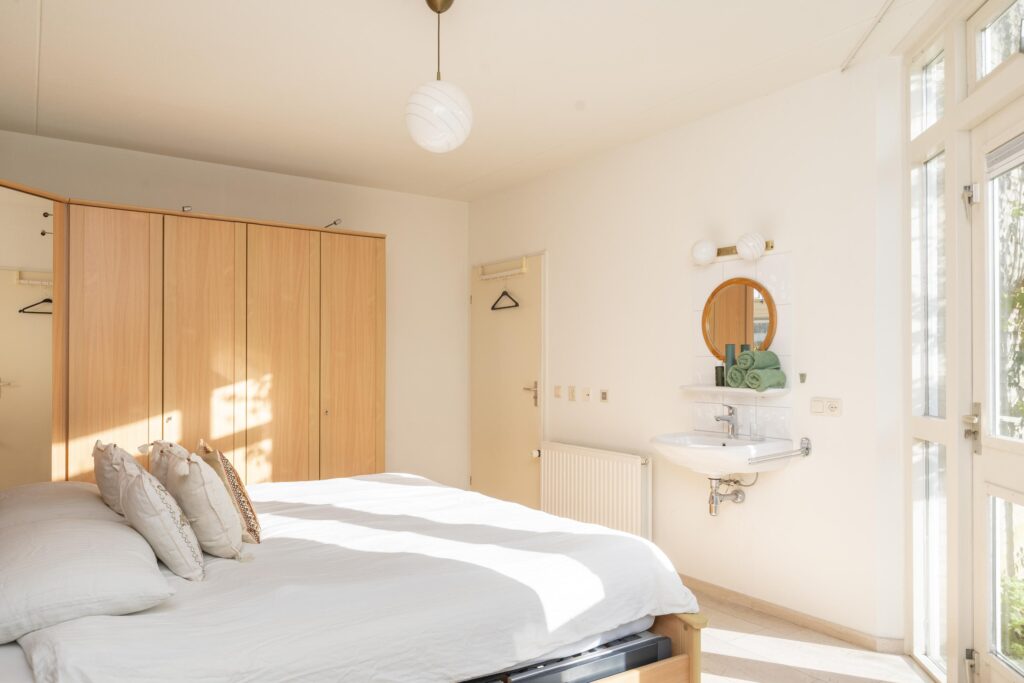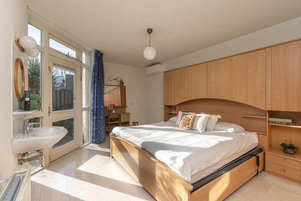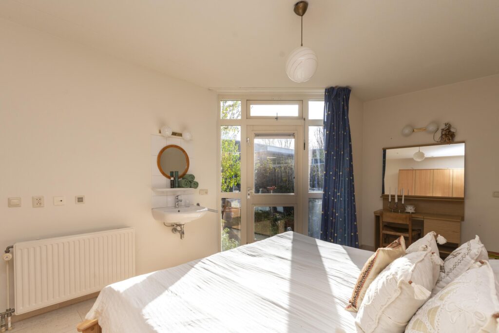 De woning beschikt over twee comfortabele slaapkamers en een badkamer op de begane grond. Deze ruimtes zijn bereikbaar via een aparte gang. De grote slaapkamer geeft via een deur toegang tot de achtertuin en is voorzien van airconditioning. De badkamer is betegeld en voorzien van een dubbele wastafel in meubel, toilet en een douche. De separate toiletruimte is betegeld en voorzien van een hangend toilet en een fonteintje.