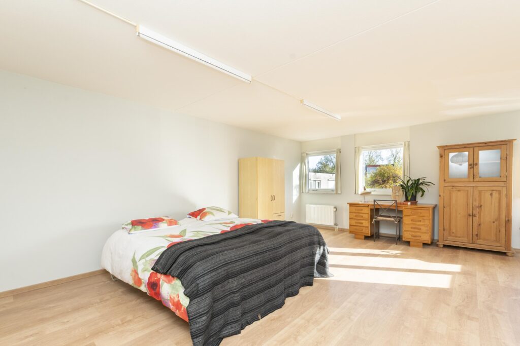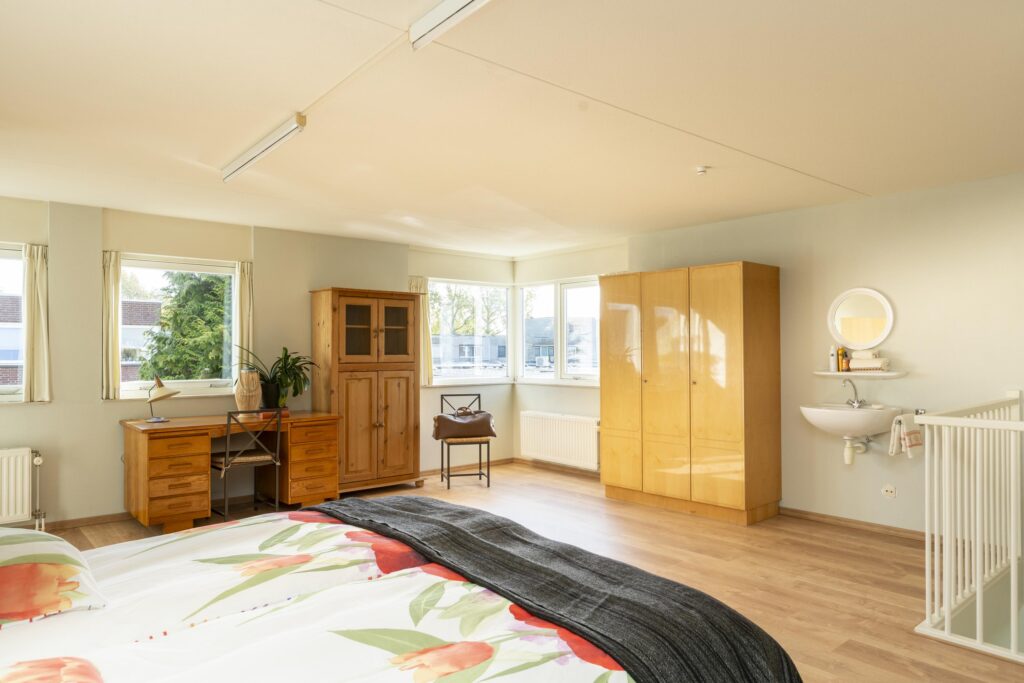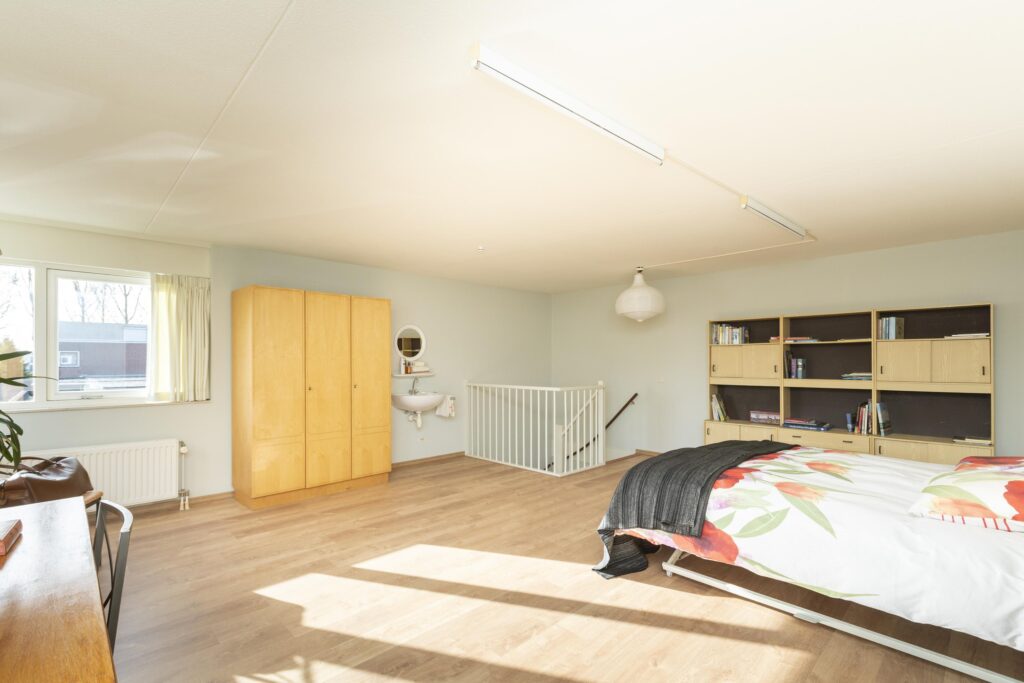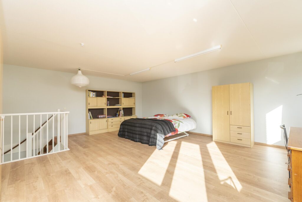 Wanneer u de trap oploopt, komt u in een heerlijke, lichte ruimte. Hier kunt u alle kanten op: maak er een royale slaapkamer van, een inspirerende werkplek of misschien juist een fijne hobbykamer. Dankzij de ramen geniet u van veel natuurlijk licht, waardoor de kamer een prettige en open sfeer heeft. De indeling is praktisch en flexibel, zodat u de ruimte eenvoudig kunt inrichten zoals u dat wilt. De aanwezige wastafel biedt extra comfort. De volledige verdieping is afgewerkt met een laminaatvloer.