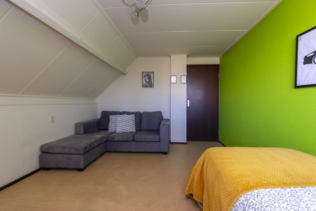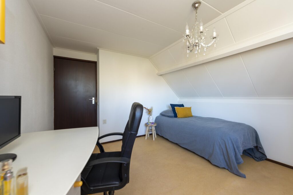 Vanuit de keuken is de bijkeuken bereikbaar. Hier vindt u handige bergruimte, de aansluitingen voor de wasapparatuur, een doorgang naar de garage en de achtertuin en de trapopgang naar een apart gelegen slaapkamer. Deze slaapkamer is afgewerkt met vloerbedekking en een dakkapel. Deze slaapkamer kan ook uitstekend dienen als chill-ruimte of mede door de eigen opgang als kantoor, praktijk en zelfs muziekstudio. De dubbele garage heeft twee garagedeuren en een kastenwand. Via de garagedeuren bereikt u de ruime oprit.