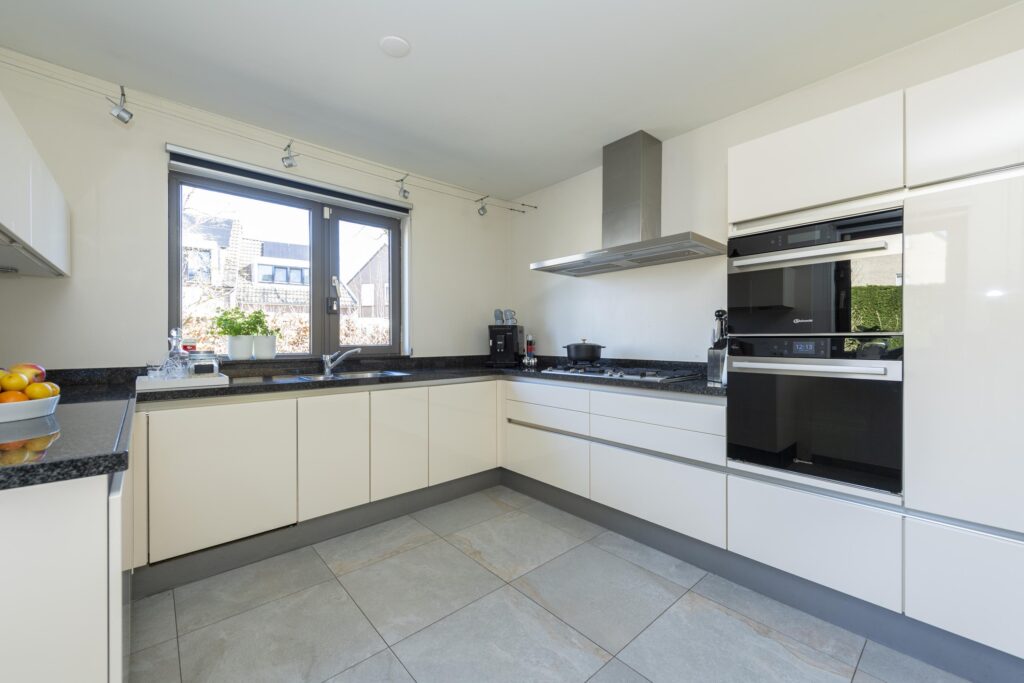 De hal/entree geeft toegang tot de meterkast (12 groepen), trapopgang, toiletruimte en de woonkamer. De toiletruimte is betegeld en voorzien van een hangend toilet en een fonteintje. De woonkamer is verdeeld in een zit- en eetkamer. Een speels detail is dat de zitkamer wat lager is gelegen. Bij de zitkamer vindt u daarnaast een sfeervolle gaskachel. Gezeten aan de keukentafel en vanuit de zitkamer heeft u daarnaast een prachtig uitzicht over de achtertuin. De keuken is gelegen bij de zitkamer en heeft een keukenblok in U-opstelling. De keuken is voorzien van veel gemakken. Zo vindt u hier een vaatwasser, RVS spoelbak (met close-in-boiler), gaskookplaat, RVS afzuigkap, combi-stoomoven, combi-magnetron en een koelkast. Vanuit de keuken heeft u via een deur toegang tot de bijkeuken. De ruime eetkamer biedt meer dan voldoende ruimte voor een riante eettafel en kasten. Ook de eetkamer kijkt mooi uit over de achtertuin. Het volledige woongedeelte is voorzien van een mooie tegelvloer (met vloerverwarming) en stucwerk op de wanden en het plafond. Door de grote raampartijen komt er daarnaast veel daglicht de ruimtes binnen.