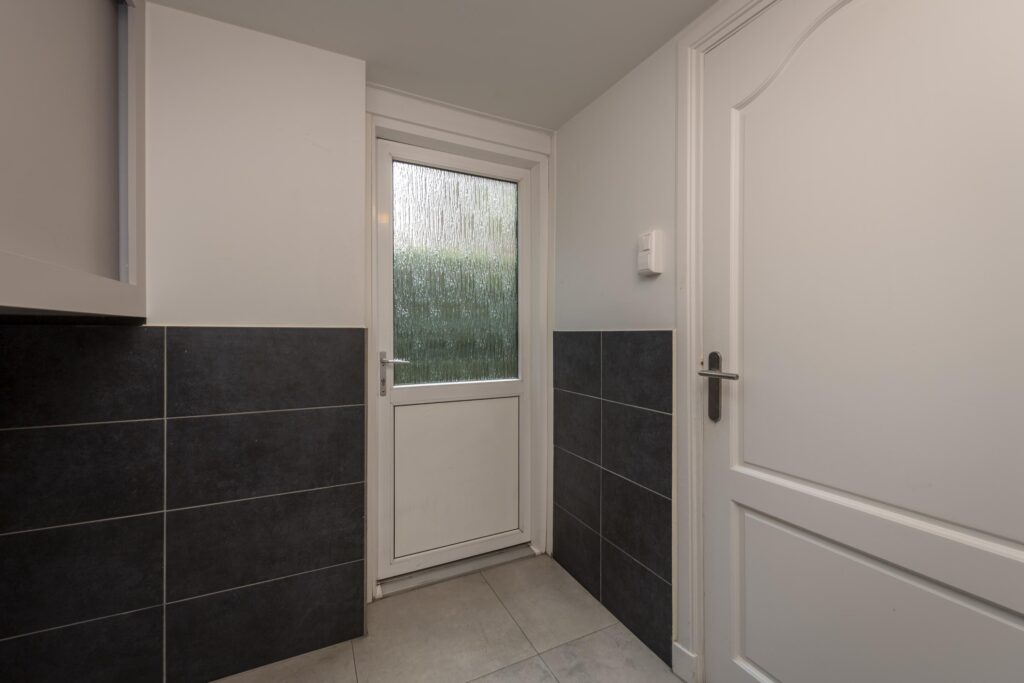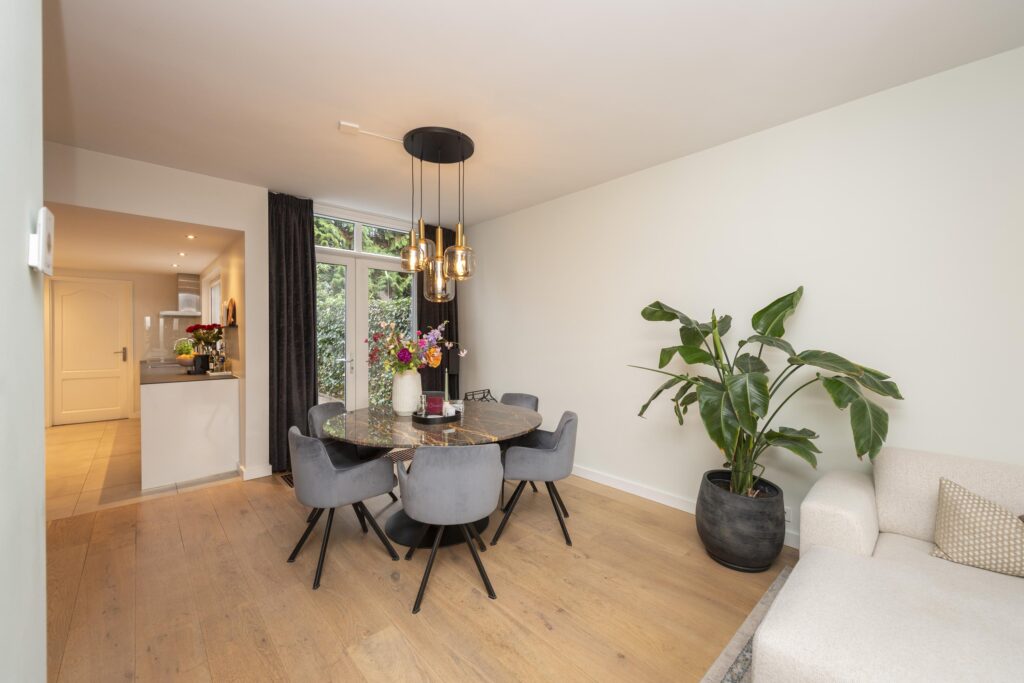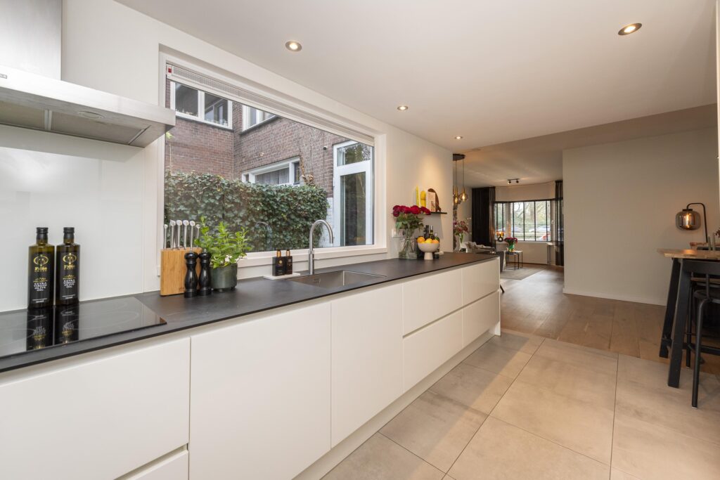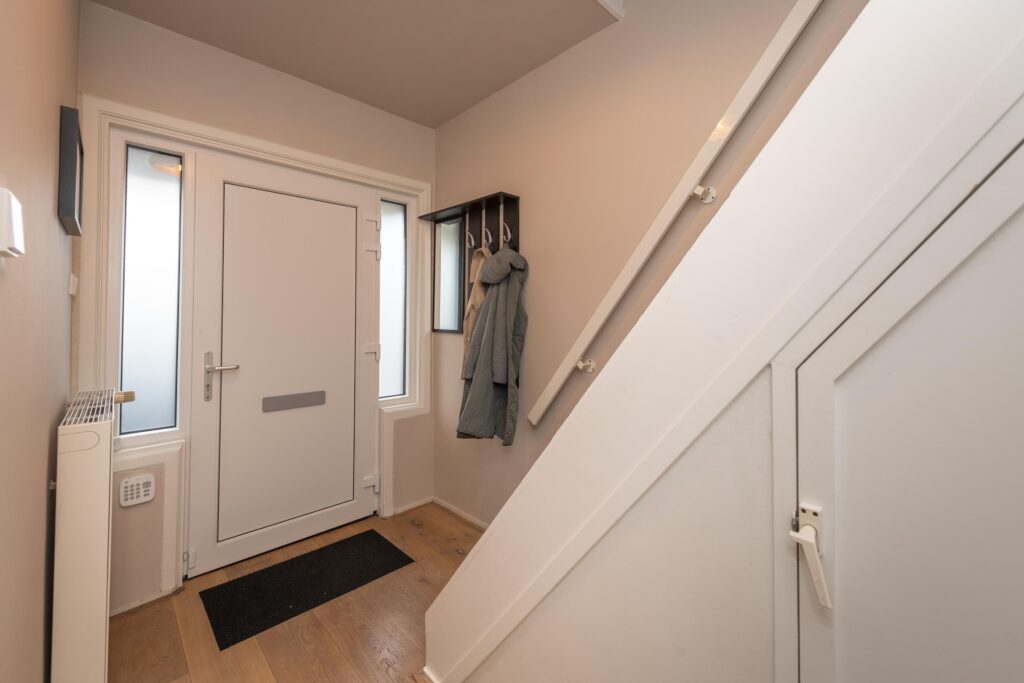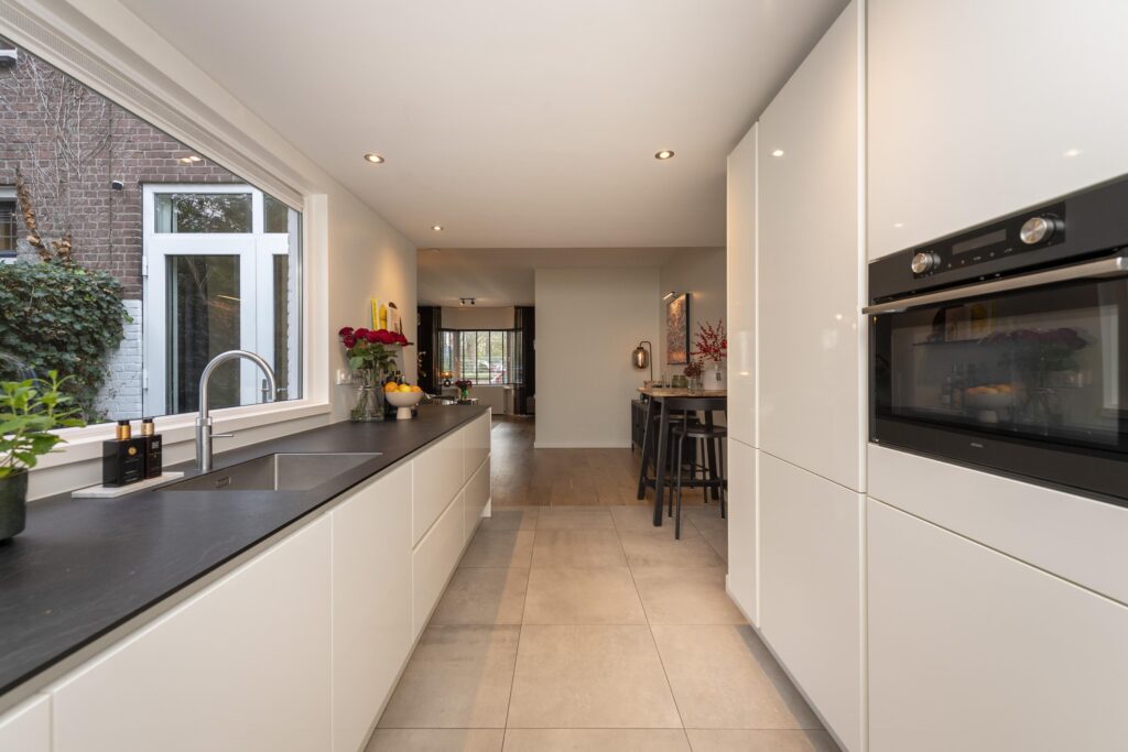 Wanneer u de woning binnenkomt, betreedt u de entree met de trapopgang naar de eerste verdieping, trapkast en toegang tot een praktisch, modern toilet. De toiletruimte is betegeld en voorzien van een hangend toilet en een fonteintje. Vanuit de hal loopt u door naar de sfeervolle woonkamer, die dankzij de erker aan de voorzijde beschikt over veel natuurlijk licht en een fijne zitruimte. De woonkamer is voorzien van een warme houten vloer, wat direct zorgt voor een uitnodigende en huiselijke sfeer. De woonkamer staat in open verbinding met de royale eethoek, waardoor er een aantrekkelijke, doorlopende leefruimte ontstaat. Vanuit hier heeft u via openslaande deuren toegang tot de achtertuin. De woonkamer staat in open verbinding met de keuken. De strakke keuken is afgewerkt met een tegelvloer voorzien van vloerverwarming en ingericht met moderne apparatuur, waaronder een koelkast, combi-oven, inductiekookplaat, afzuigkap, spoelbak met Quooker en een vaatwasser (alle ATAG). Hier geniet u van een comfortabele en functionele kookomgeving. Aangrenzend aan de keuken ligt de praktische bijkeuken, ideaal voor extra opslagruimte. Ook is hier een kast aanwezig, perfect voor voorraad of huishoudelijke spullen. Vanuit de bijkeuken heeft u direct toegang tot de achtertuin.