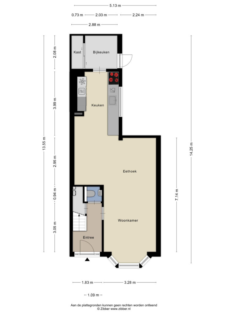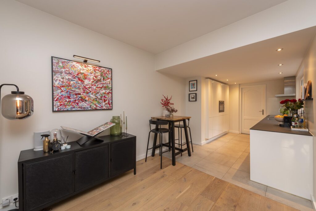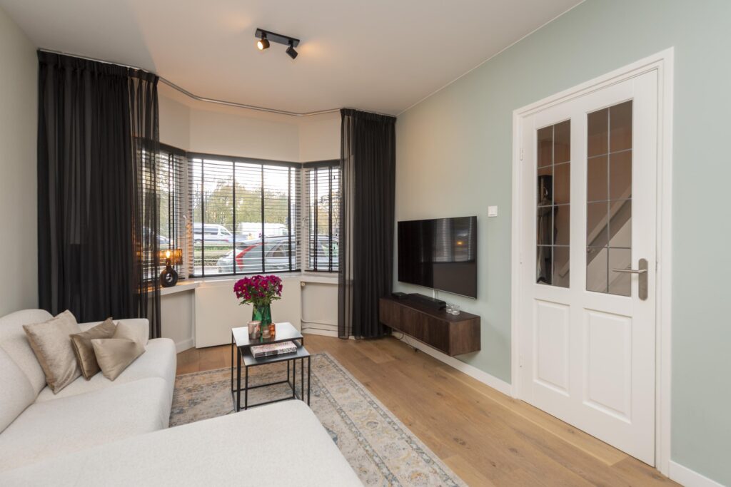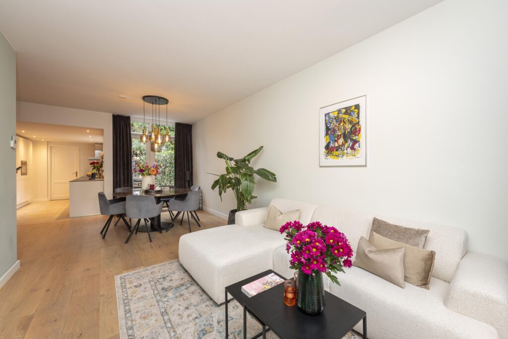 Wanneer u de woning binnenkomt, betreedt u de entree met de trapopgang naar de eerste verdieping, trapkast en toegang tot een praktisch, modern toilet. De toiletruimte is betegeld en voorzien van een hangend toilet en een fonteintje. Vanuit de hal loopt u door naar de sfeervolle woonkamer, die dankzij de erker aan de voorzijde beschikt over veel natuurlijk licht en een fijne zitruimte. De woonkamer is voorzien van een warme houten vloer, wat direct zorgt voor een uitnodigende en huiselijke sfeer. De woonkamer staat in open verbinding met de royale eethoek, waardoor er een aantrekkelijke, doorlopende leefruimte ontstaat. Vanuit hier heeft u via openslaande deuren toegang tot de achtertuin. De woonkamer staat in open verbinding met de keuken. De strakke keuken is afgewerkt met een tegelvloer voorzien van vloerverwarming en ingericht met moderne apparatuur, waaronder een koelkast, combi-oven, inductiekookplaat, afzuigkap, spoelbak met Quooker en een vaatwasser (alle ATAG). Hier geniet u van een comfortabele en functionele kookomgeving. Aangrenzend aan de keuken ligt de praktische bijkeuken, ideaal voor extra opslagruimte. Ook is hier een kast aanwezig, perfect voor voorraad of huishoudelijke spullen. Vanuit de bijkeuken heeft u direct toegang tot de achtertuin.