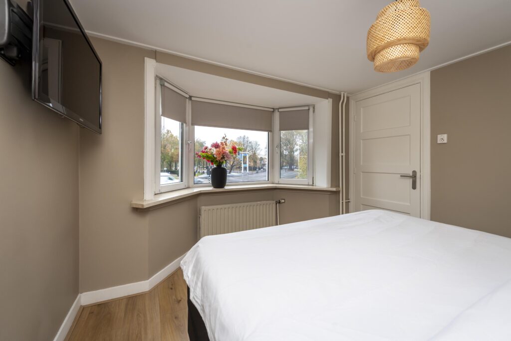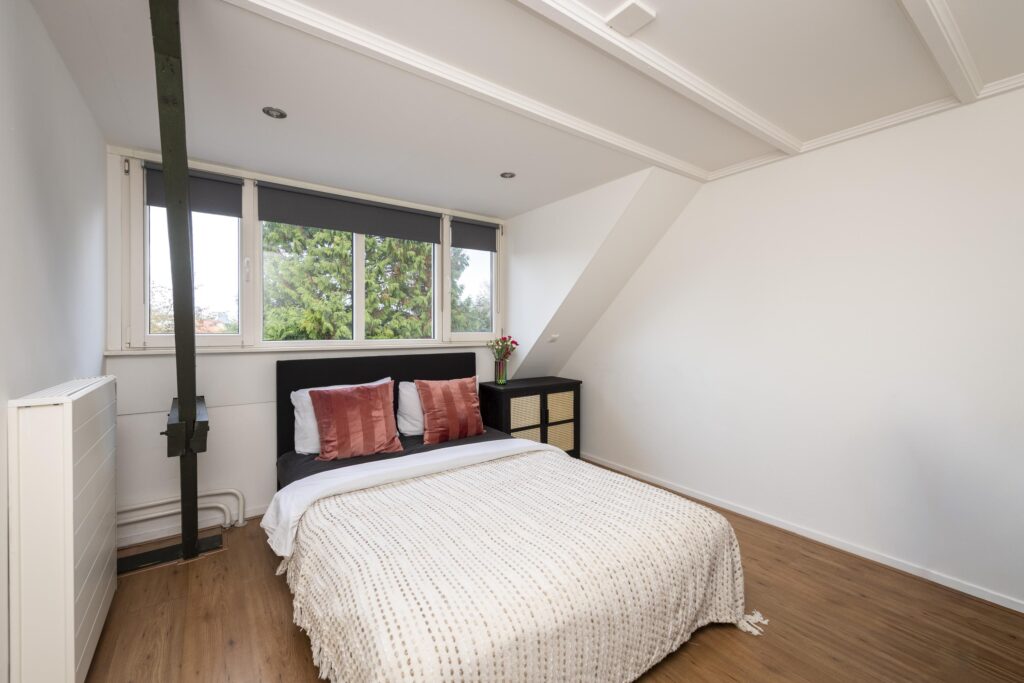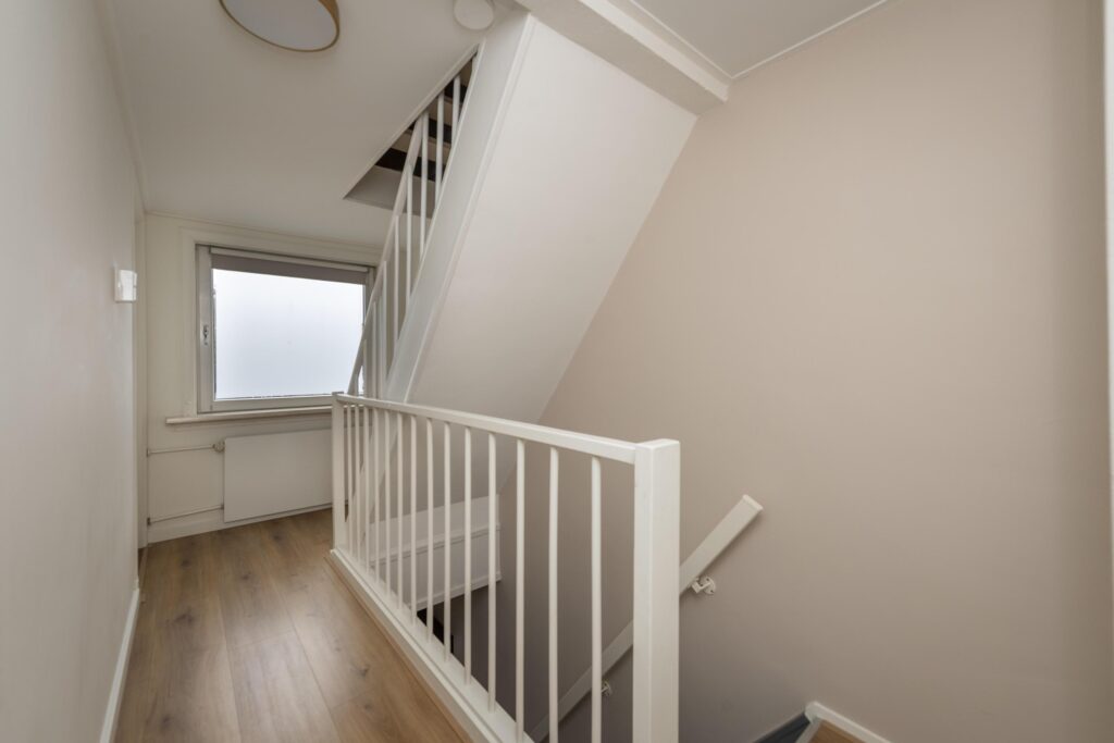 Via de trap bereikt u de overloop, die toegang biedt tot twee ruime slaapkamers en de badkamer. De slaapkamer aan de voorzijde valt direct op door de karakteristieke erker, die niet alleen extra ruimte creëert, maar ook zorgt voor veel natuurlijk licht en een fraaie uitstraling. Aan de achterzijde bevindt zich de tweede ruime slaapkamer, eveneens licht en goed in te richten. Dankzij de grote raampartij heeft u mooi zicht op de achtertuin. Beide slaapkamers zijn voorzien van airconditioning (2025). De prachtige badkamer (2023) is volledig betegeld en praktisch ingedeeld. De badkamer is voorzien van een ligbad, inloopdouche, toilet en een dubbele wastafel in meubel. Hier heeft u alle ruimte en comfort dat nodig is voor het dagelijkse gebruik.