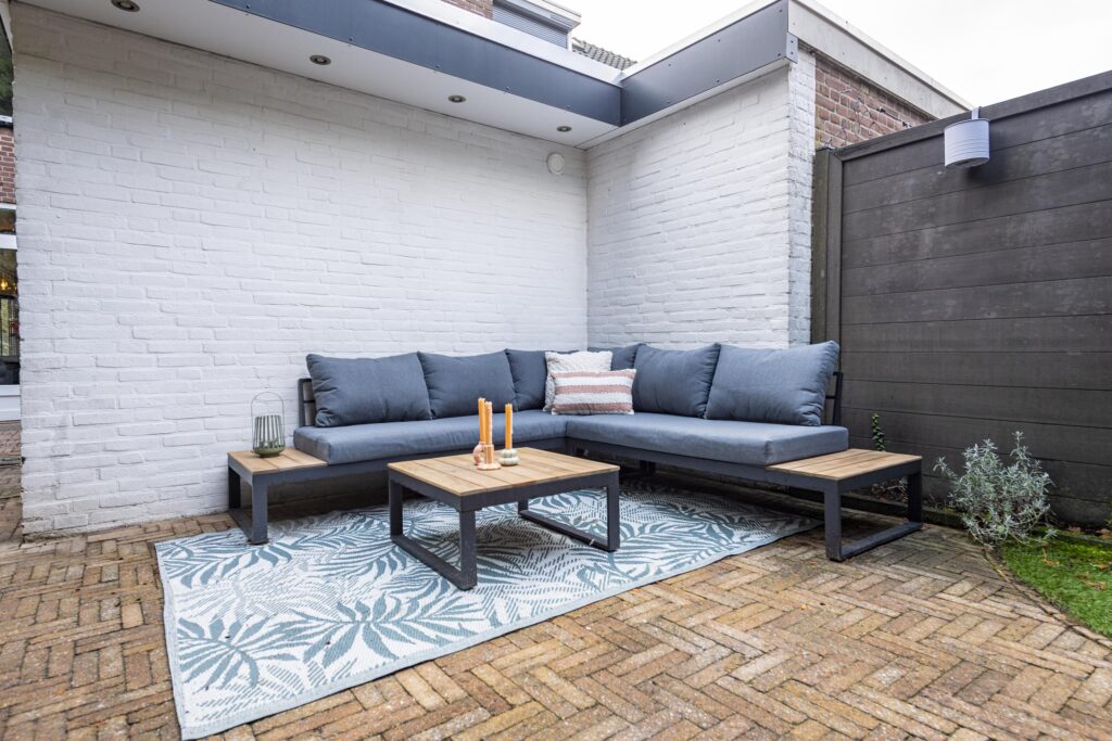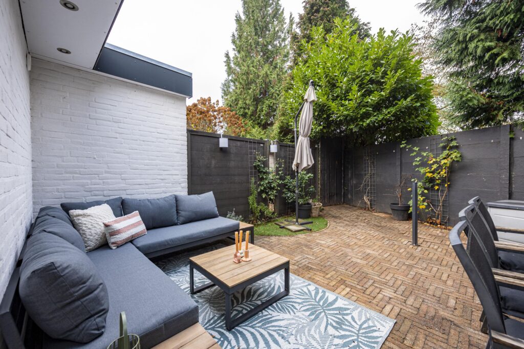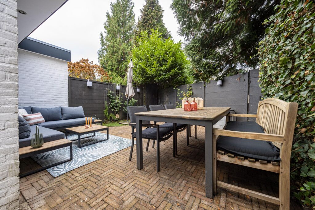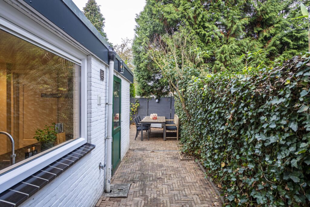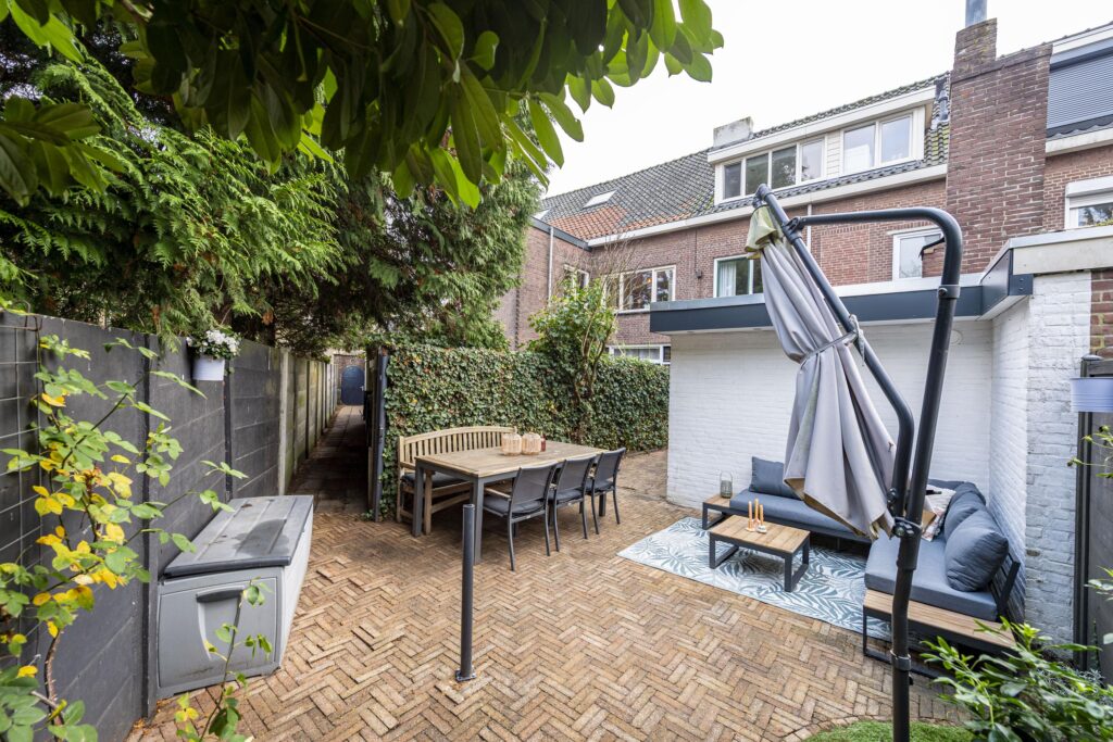De verzorgde achtertuin op het noordwesten biedt u een heerlijke plek om volop te genieten. Dankzij de slimme indeling beschikt de tuin over meerdere mogelijkheden. Zo is er voldoende ruimte voor een lounge hoek en een grote eettafel, waardoor u fijn uw vrienden en familie kunt ontvangen voor een barbecue of gezellige borrel. De tuin is volledig bestraat met fraaie waaltjes en afgewisseld met groenaccenten langs de randen, wat zorgt voor een warme en sfeervolle uitstraling. Achterin de tuin vindt u de achterom die toegang geeft tot de brandgang. De buren van Ringbaan-Zuid 99 hebben recht van overpad naar de brandgang. Door het plaatsen van een schutting is dit overpad niet meer van toepassing.