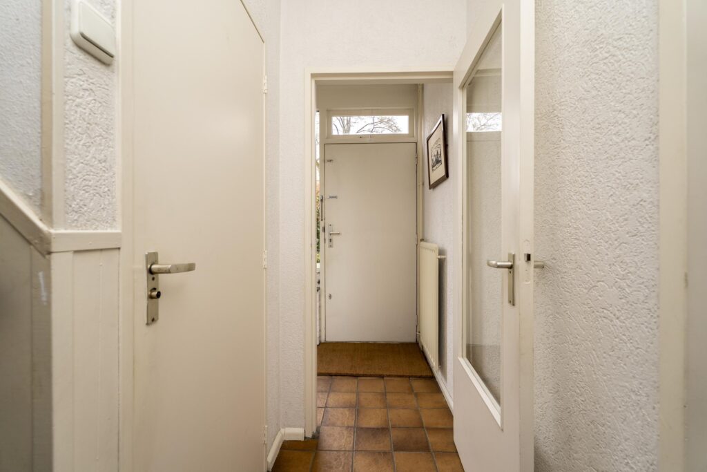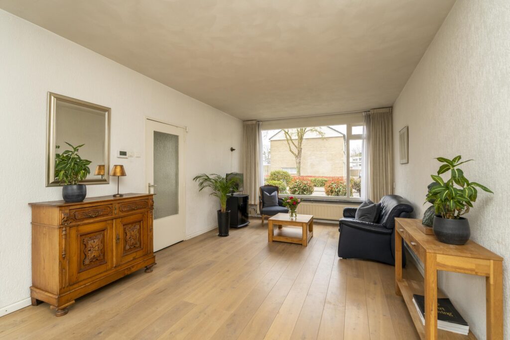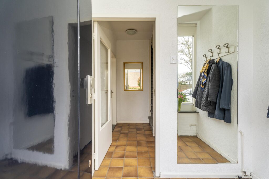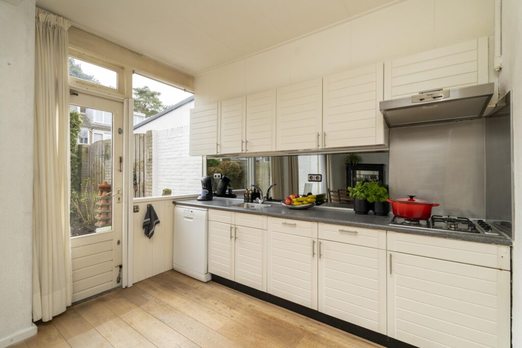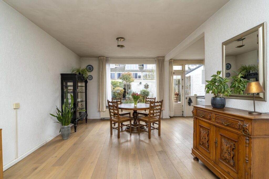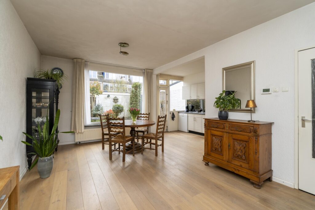 De entree, met garderobe, geeft toegang tot de hal. De hal biedt op zijn beurt toegang tot de toiletruimte, trapopgang en de woonkamer. De toiletruimte is betegeld en voorzien van een staand toilet en een fonteintje. De woonkamer strekt zich over de volledig diepte van de woning. De woonkamer is keurig afgewerkt met een houten vloer en granol op de wanden. Door de grote raampartijen komt er veel daglicht de ruimte binnen. De woonkamer staat in open verbinding met de keuken. De keuken heeft een keukenblok in rechte opstelling en is voorzien van een gaskookplaat, afzuigkap, RVS spoelbak en een vaatwasser. Daarnaast vindt u in de keuken een handige en ruime vaste kast. Ook heeft u vanuit de keuken via een deur toegang tot de achtertuin.