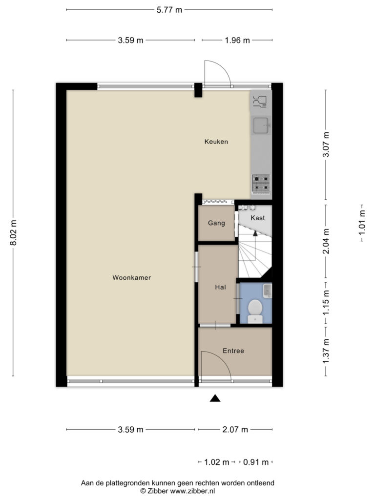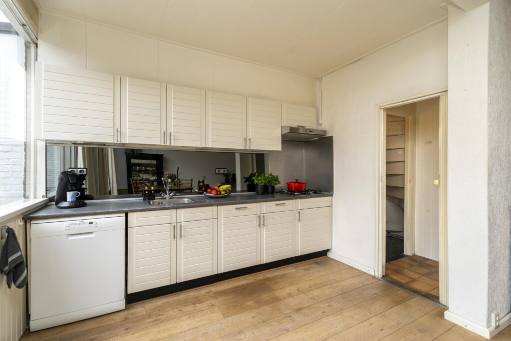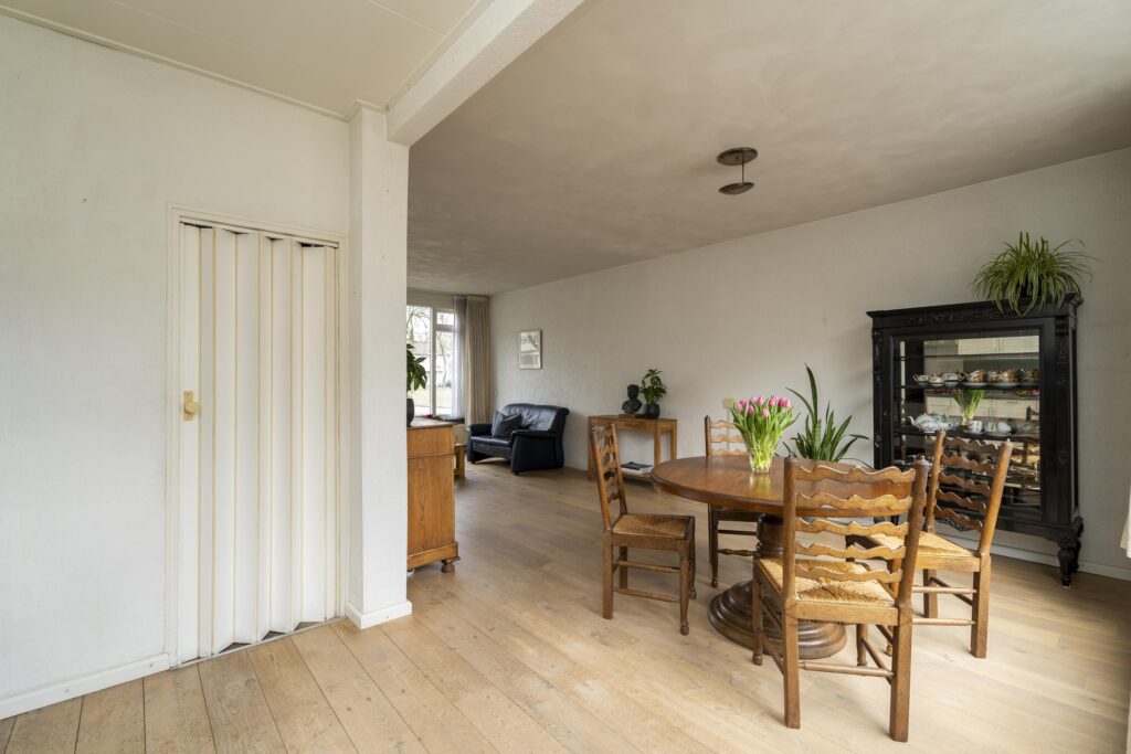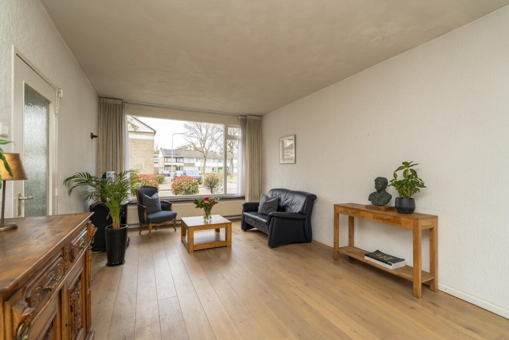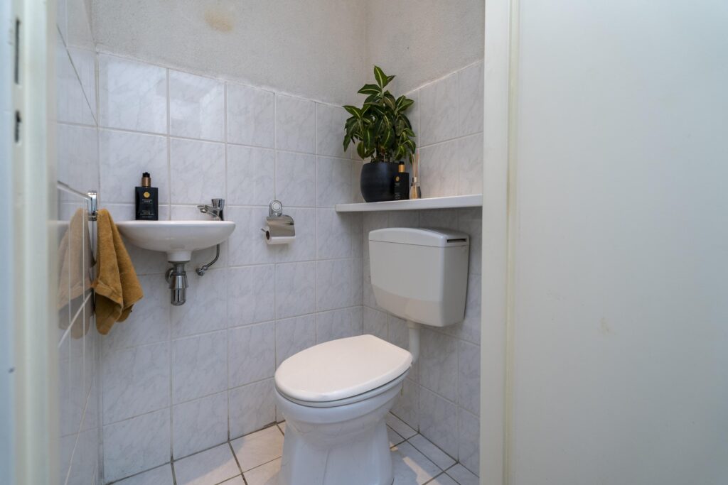 De entree, met garderobe, geeft toegang tot de hal. De hal biedt op zijn beurt toegang tot de toiletruimte, trapopgang en de woonkamer. De toiletruimte is betegeld en voorzien van een staand toilet en een fonteintje. De woonkamer strekt zich over de volledig diepte van de woning. De woonkamer is keurig afgewerkt met een houten vloer en granol op de wanden. Door de grote raampartijen komt er veel daglicht de ruimte binnen. De woonkamer staat in open verbinding met de keuken. De keuken heeft een keukenblok in rechte opstelling en is voorzien van een gaskookplaat, afzuigkap, RVS spoelbak en een vaatwasser. Daarnaast vindt u in de keuken een handige en ruime vaste kast. Ook heeft u vanuit de keuken via een deur toegang tot de achtertuin.