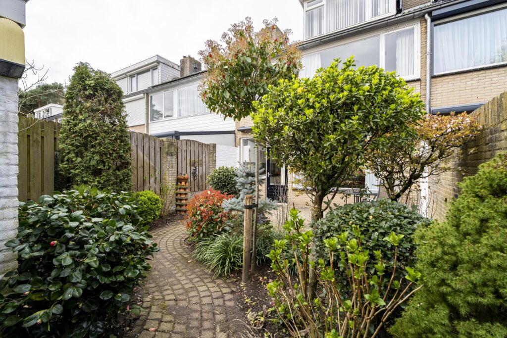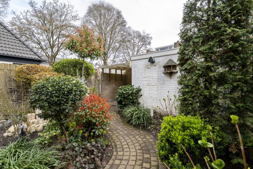 De woning beschikt over zowel een voor- als achtertuin. De ruime achtertuin is gelegen op het zonnige zuidoosten en is fraai aangelegd met sierbestrating en plantenborders met veel groene beplanting. Achterin de tuin vindt u de vrijstaande stenen berging (ca. 9 m², met overkapping en elektra) en de achterom. De achterom geeft toegang geeft tot de brandgang achter de woningen.