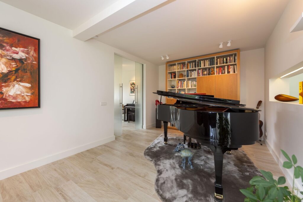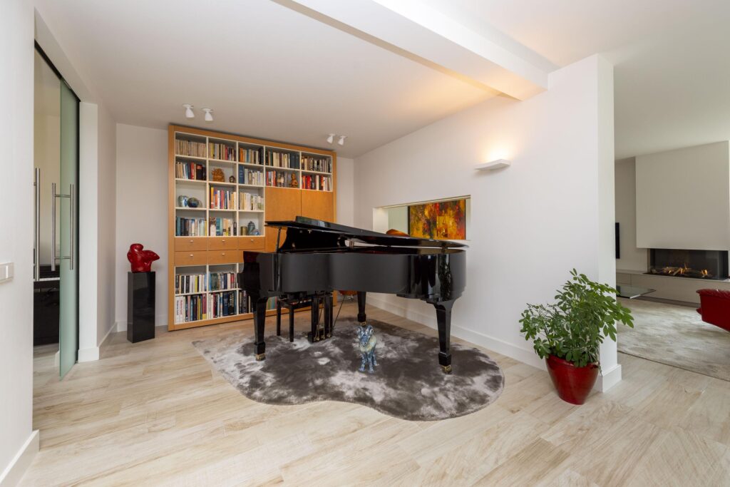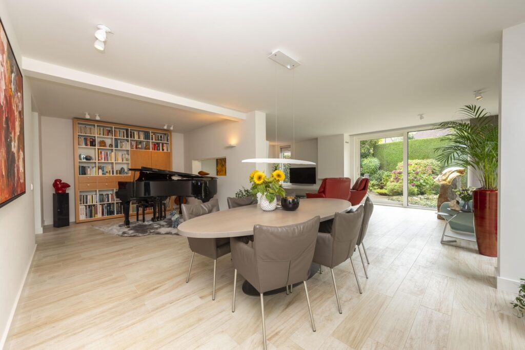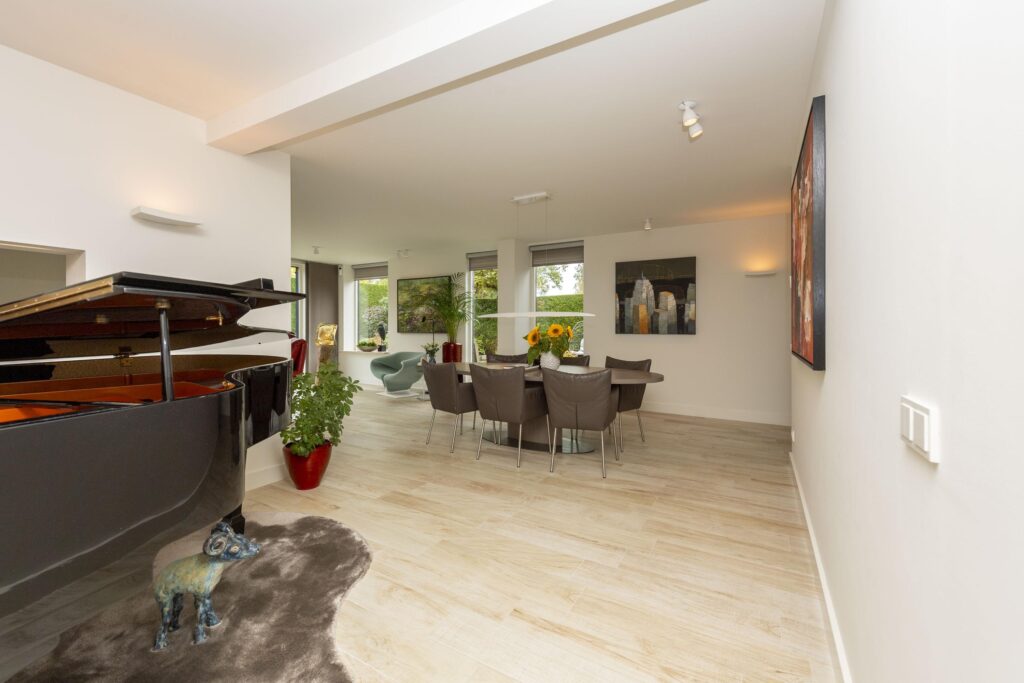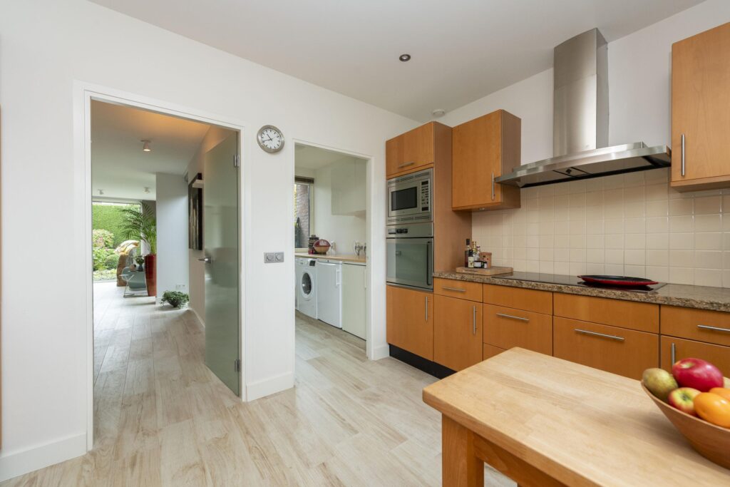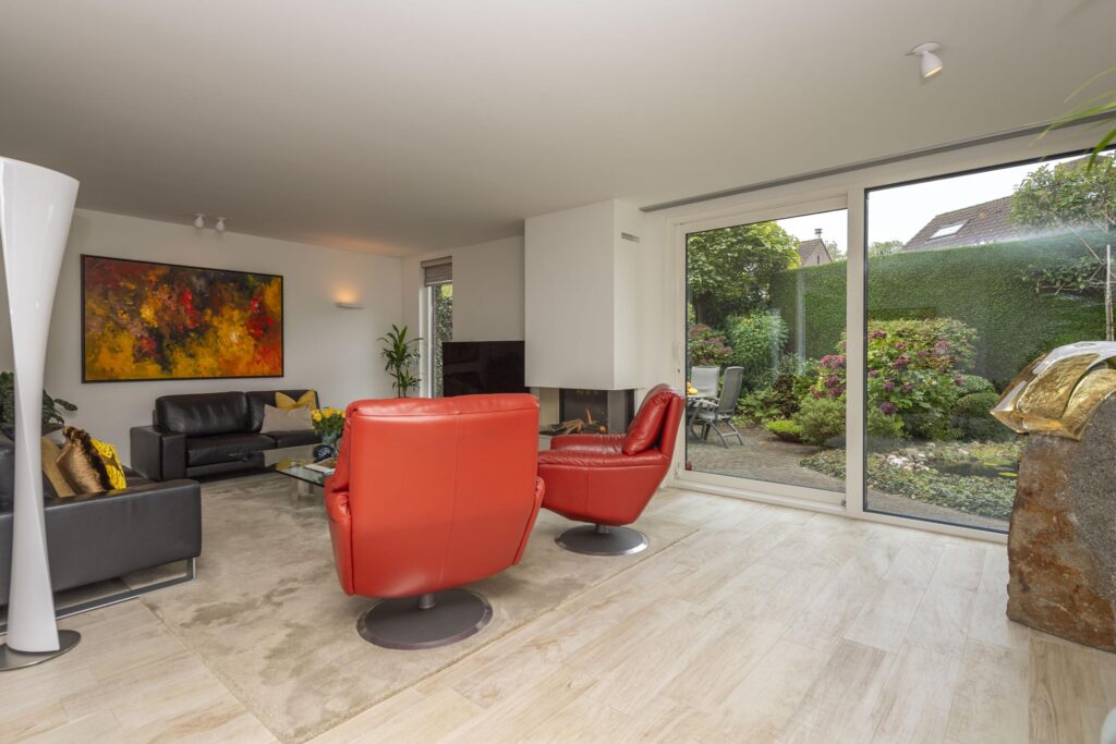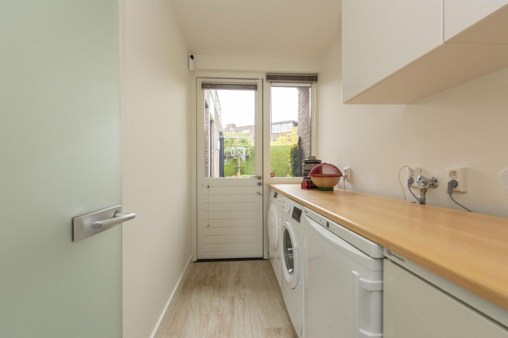 Wanneer u deze woning binnenstapt, ervaart u direct de ruimte en het comfort die deze woning uniek maken. De entree met ingebouwde garderobe is ruim opgezet en geeft toegang tot de toiletruimte, meterkast, trapopgang en het woongedeelte. De toiletruimte is betegeld en voorzien van een hangend toilet en een fonteintje. Aan de voorzijde van de woning bevindt zich een fijne werkkamer, ideaal als thuiskantoor of studeerruimte, met uitzicht op het groen aan de voorzijde. De kamer betreedt u via prachtige hardglazen schuifdeuren. De woonkamer is stijlvol verbonden met de hal via een hardglazen deur en door de verbrede doorgang is een extra gevoel van openheid en verbinding ontstaan tussen de verschillende leefruimtes. De woonkamer is ruim en licht, met grote raampartijen en een aluminium schuifpui die zorgt voor een prettige verbinding met de tuin. De sfeer is warm en uitnodigend, mede dankzij de aanwezigheid van een gashaard (Dru, met afstandsbediening). Door de aanwezigheid van een muur met doorkijk is de woonkamer speels in twee delen verdeeld. De keuken aan de voorzijde van de woning biedt volop mogelijkheden en grenst direct aan een praktische bijkeuken. De keuken heeft een keukenblok in U-opstelling en is voorzien van veel gemakken. Zo vindt u hier een oven, combi-oven, inductie kookplaat, RVS afzuigkap, RVS spoelbak (met close-in-boiler), vaatwasser en een koelkast. In de bijkeuken vindt u de aansluitingen voor de wasapparatuur en ruimte voor bijvoorbeeld een extra koelkast en vriezer. Ook heeft u vanuit de bijkeuken direct toegang tot de achtertuin. De volledige begane grond is voorzien van een mooie lichte keramische tegelvloer (met vloerverwarming) en stucwerk op de wanden en plafonds. Met aandacht voor detail en slimme indelingskeuzes biedt deze woning een perfecte combinatie van leefruimte, comfort en functionaliteit.