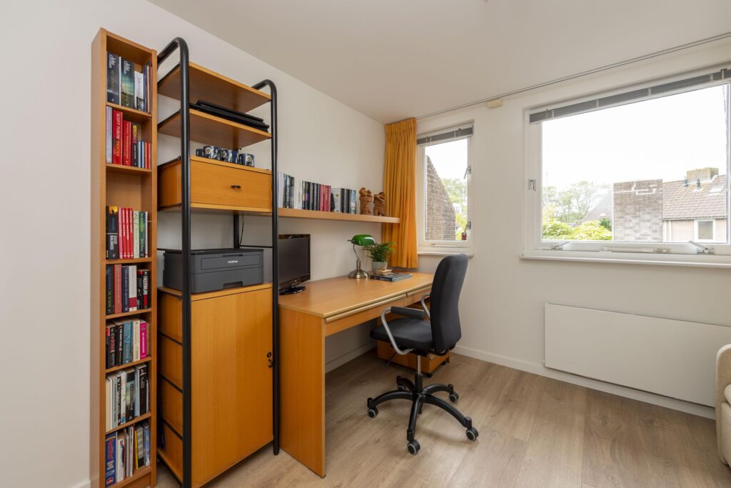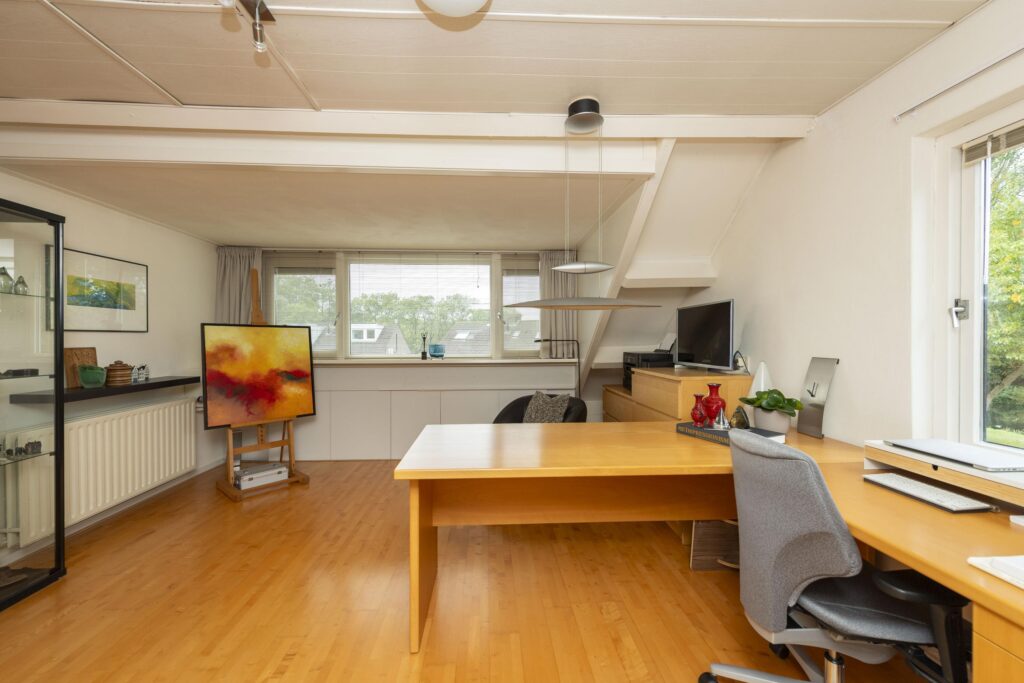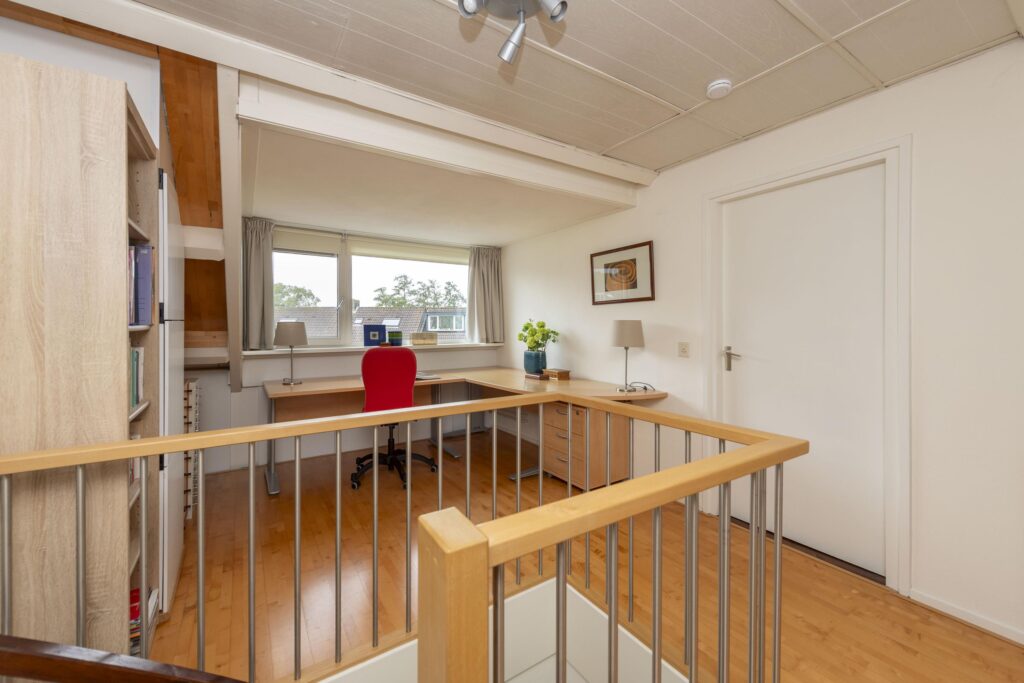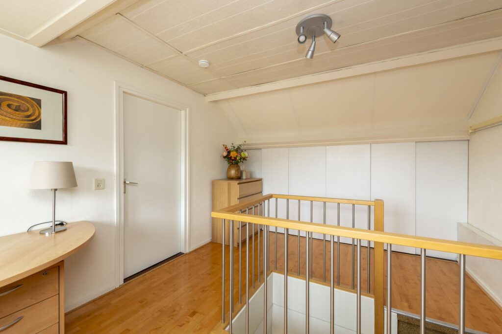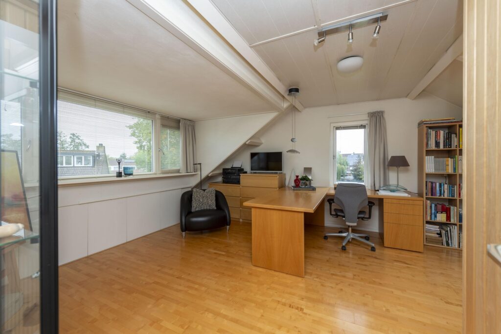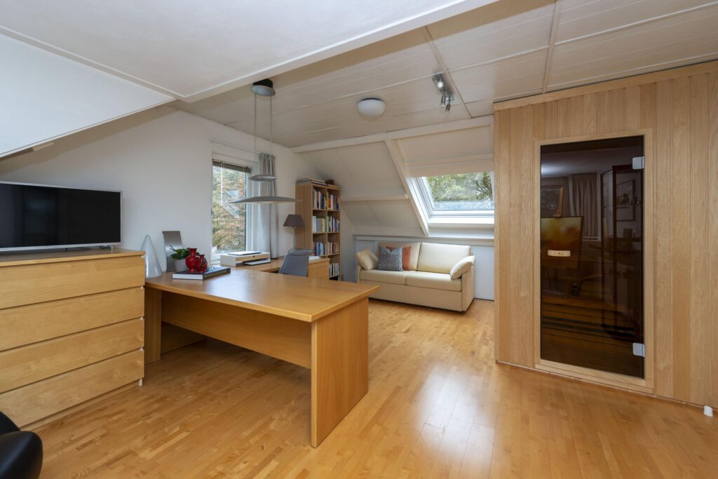 Op de bovenste verdieping van deze woning wachten een verrassend ruime voorzolder en slaapkamer. De praktische indeling en het karakter van de schuine kap met dakkapellen zorgen voor een ruimtelijke sfeer. Op het voorste gedeelte vindt u een prettige werkplek. De slaapkamer is ruim bemeten en de aanwezige knieschotten bieden extra bergruimte zonder concessies te doen aan het gebruiksoppervlak. In de kamer is daarnaast een 2-persoons sauna (infrarood & stenen) aanwezig. De volledige verdieping is mooi afgewerkt met een parketvloer en tevens vindt u hier de opstelling van de CV-ketel (2019) met ombouw. In de nok zijn daarnaast twee vlieringen aanwezig voor nog meer opbergruimte. De verdieping biedt vele mogelijkheden, en past zich waar nodig moeiteloos aan aan veranderende woonwensen.