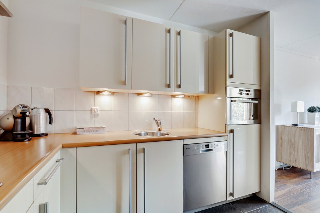 De woonkamer (ca. 36 m²) is gelegen aan de voorzijde van het appartement en is afgewerkt met een nette laminaatvloer. De keuken beschikt over een keukenblok in hoekopstelling en is voorzien van een keramische kookplaat, afzuigkap, vaatwasser en een combimagnetron. Vanuit de keuken bereikt u de bergruimte. Hier bevinden zich de aansluitingen voor de wasapparatuur en de CV-ketel.